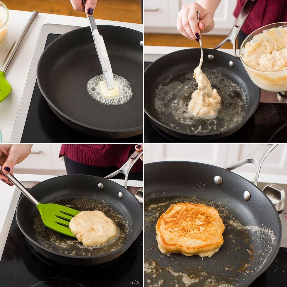 - Heat butter in a large skillet over medium heat. Spoon batter into the pan. Flip the pancake when bubbles start to appear on the surface. Cook until golden on the other side.