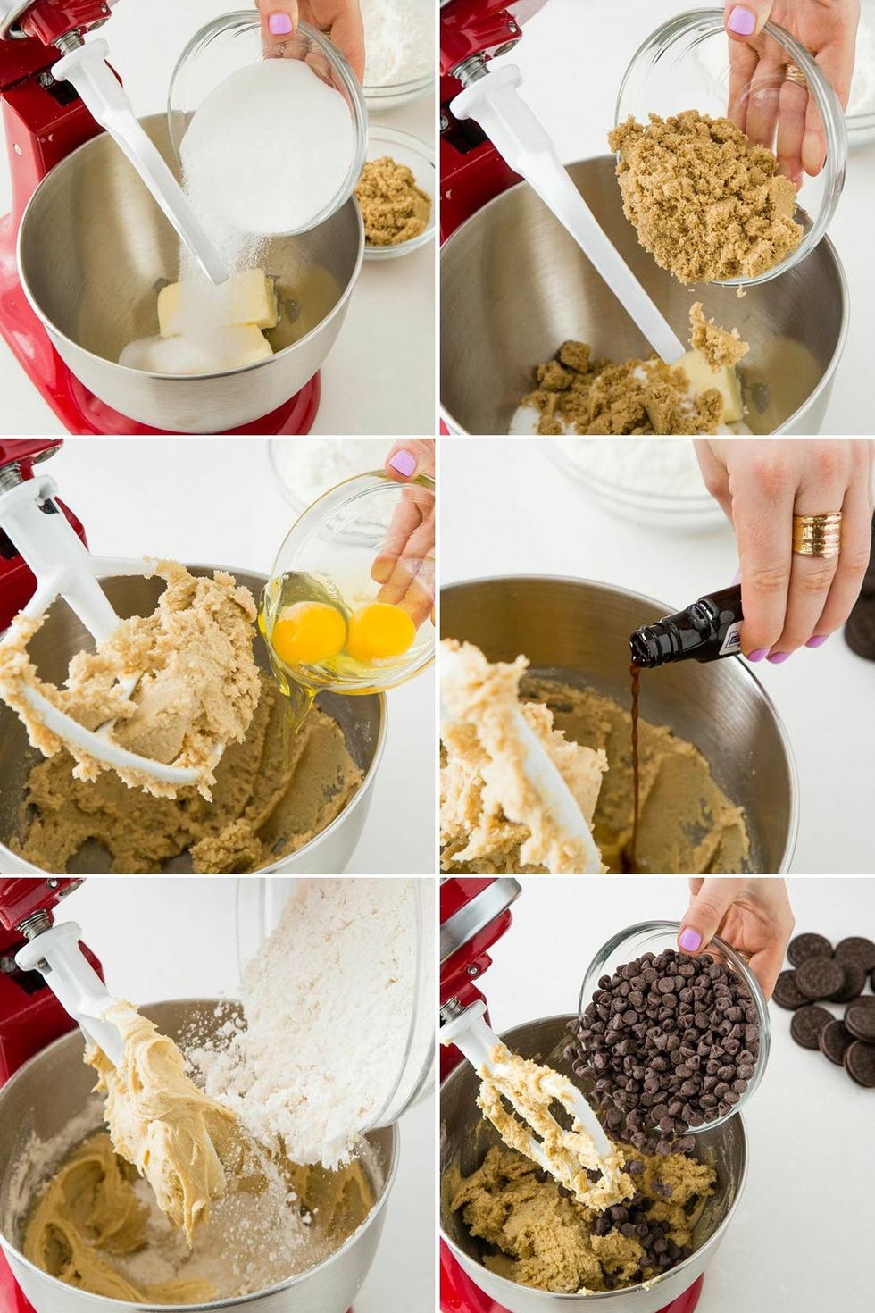 - Break up 12 Oreos and add them to the dough. Mix. Scoop the dough into a muffin pan. Bake for 15 minutes.