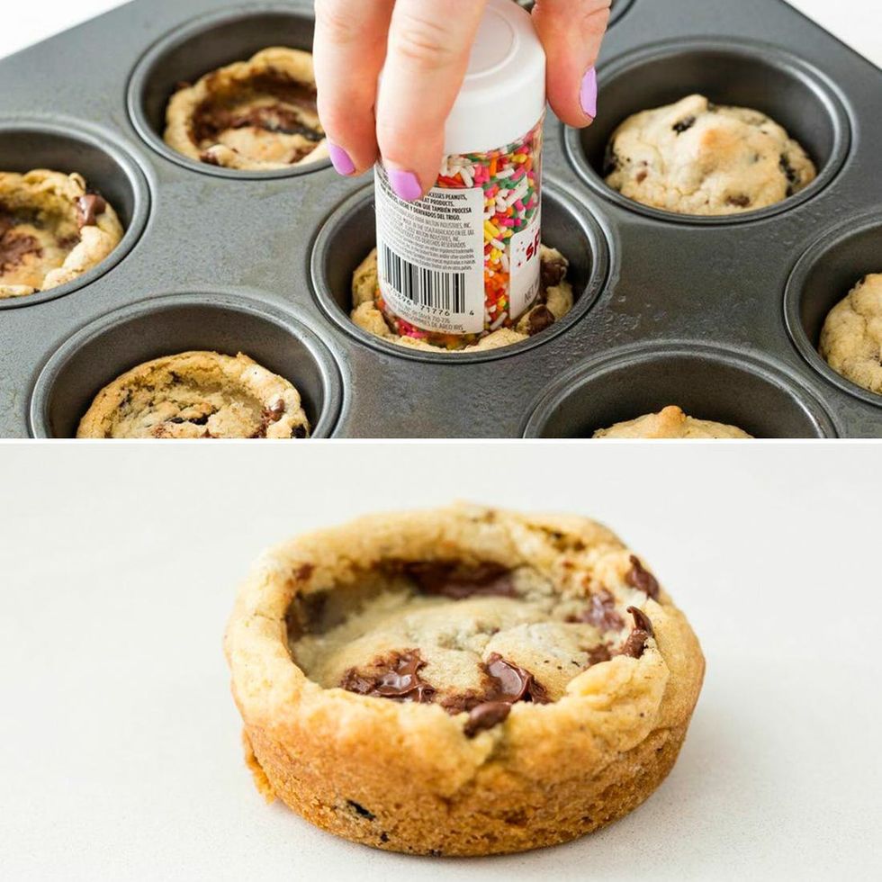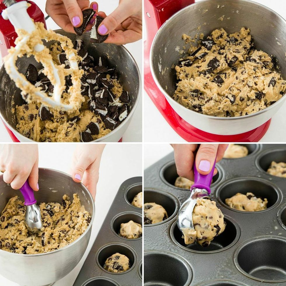 Break up 12 Oreos and add them to the dough. Mix. Scoop the dough into a muffin pan. Bake for 15 minutes.