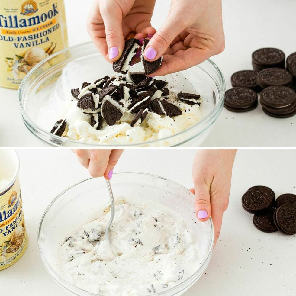In a large bowl, combine one carton of softened vanilla ice cream with 24 Oreos. Freeze for 45 minutes, or until the ice cream is firm.