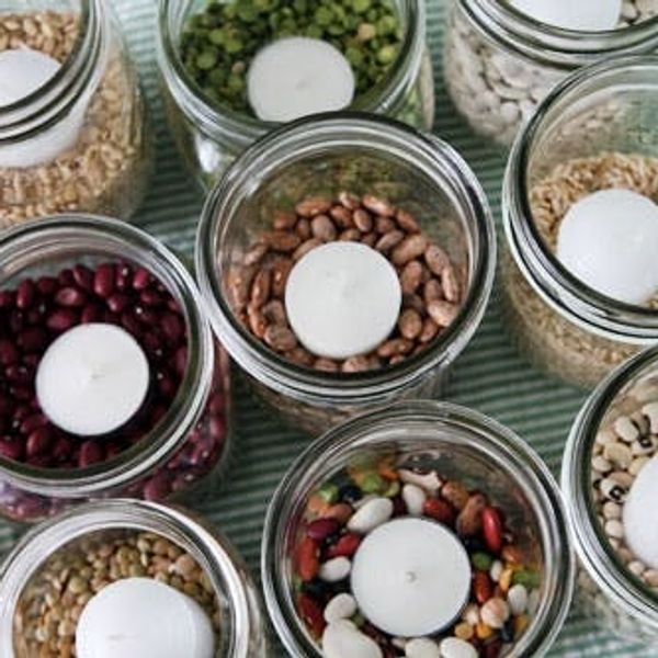 Plus, if you use votive candles or tea lights that come in thin metal casing, you can actually reuse the beans or grains after the wedding, or give them away as favors with your favorite recipes attached.