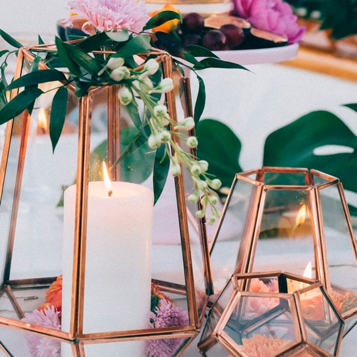 1. Hexagon Lanterns: Multi-faceted lanterns offer a subtle way to incorporate copper into your wedding day. Have them serve double duty by lining the aisle for your ceremony, then adding them to your reception tables for centerpieces. (Photo via Hailey Howard Photography)