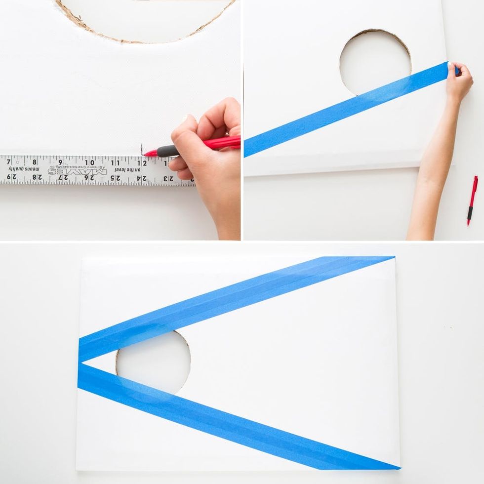 Time to paint! We chose to do geometric racing stripes. Find the center of your canvas and place tape from the center mark to the bottom corner. Repeat on both sides.