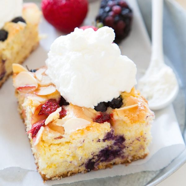 With Labor Day around the corner, we’re starting to prep for our final summer cookout. Whether you’ve got some fun DIYs planned, or you’re whipping up a festive Labor Day recipe, you need to include this patriotic dessert in your weekend plans! This cornmeal cake is super easy to make and is perfect for a crowd. It’s a vanilla-cornmeal base scented with almond extract and studded with fresh, sugary red and blue berries. Serve with whipped cream for the full red, white and blue effect (because, why not?) — this treat belongs on your Labor Day party spread!