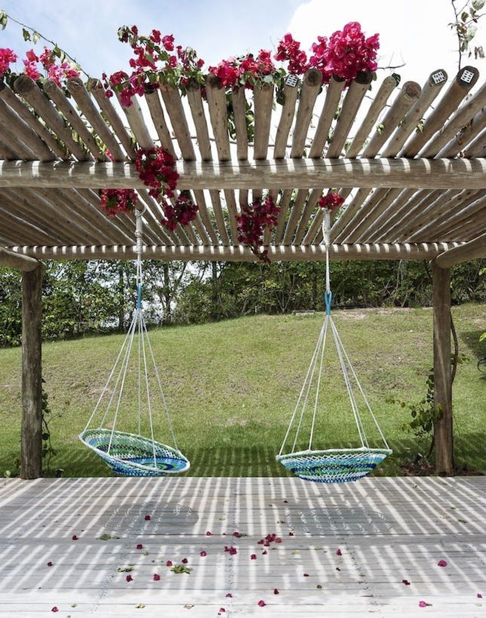 In the expansive backyard, you'll find two playful swings, which she added to bring a sense of whimsy to her vacation home's poolside views. "These swings are our design. We love the pops of color and how the blue reflects the ocean, the sky, and the color of the pool," Cortney says. "The swings are hung underneath a trellis of wood that's woven with flowers. There's nothing quite like having a good laugh with someone while swinging in the sunshine."