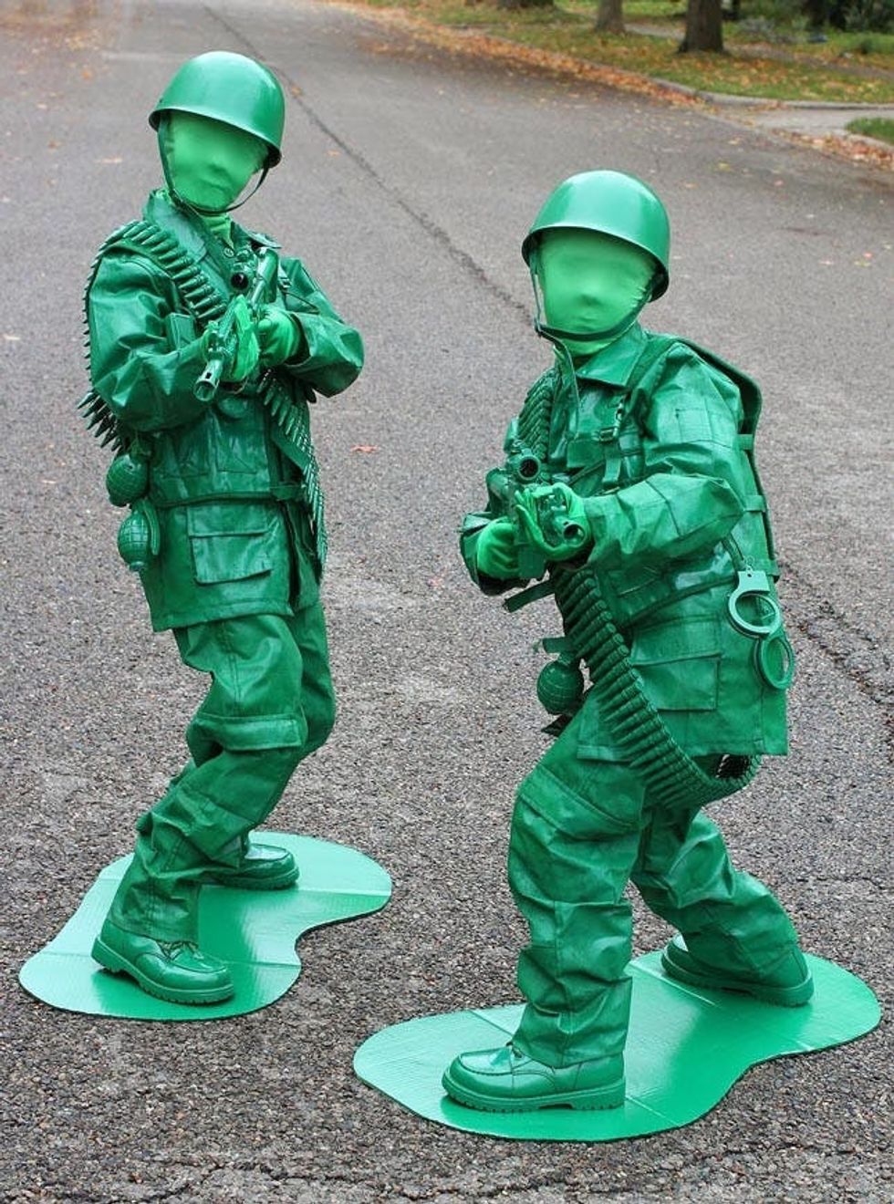 1. Green Toy Army Men: First up, the parents of these kids definitely did a stellar job of recreating the army men from Toy Story. The green morphsuits underneath really take this costume to the next level.