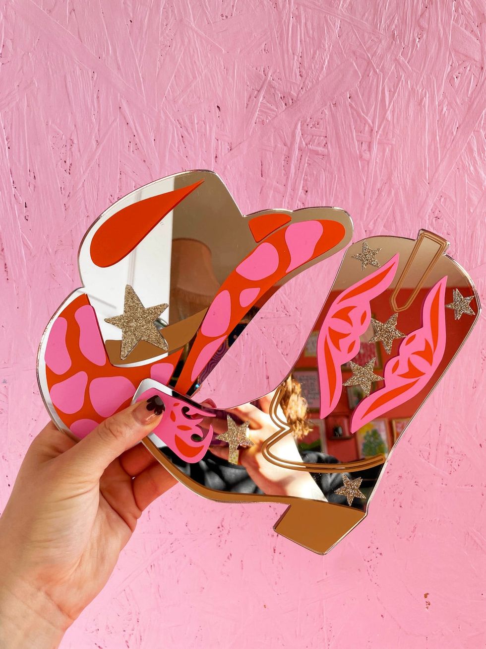 Handmade to order using pink, orange, and gold glitter vinyl, these music city inspired mirrors would add a sparkling southern flare to any gallery wall. Lightweight and on the smaller side, this mini mirror duo comes with command strips for easy hanging.