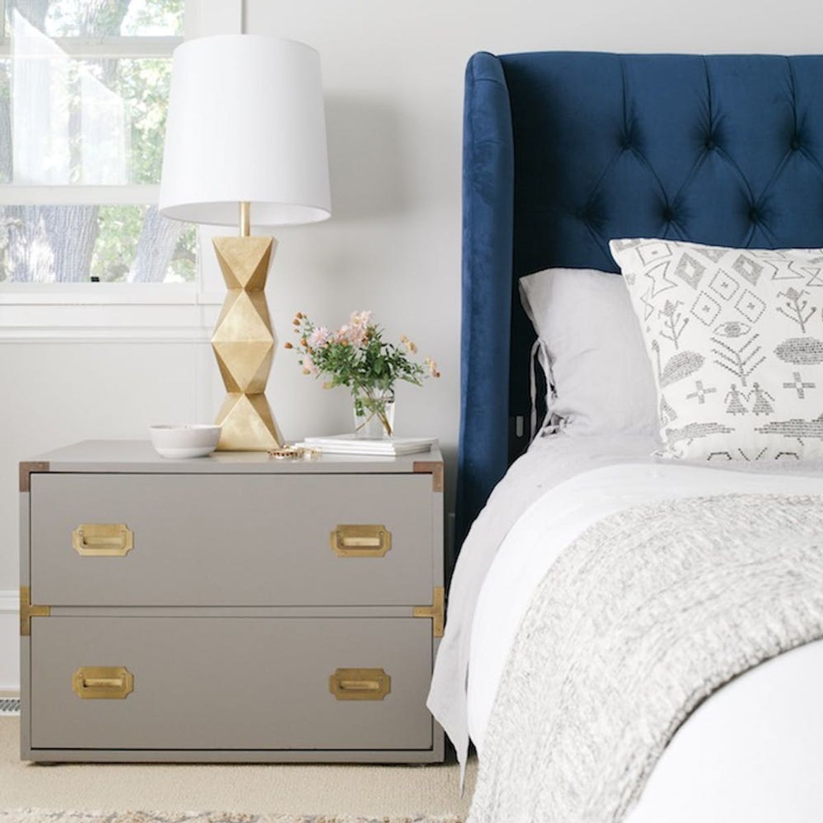2. Nightstand Essentials: A good beside table should be styled and stocked with the essentials you want within reach while lounging. Think a moisturizing lip balm, hand cream and a good book or two. DIY yourself a marbled jewelry dish and add fresh flowers and a candle for major elegance. (via The Everygirl)