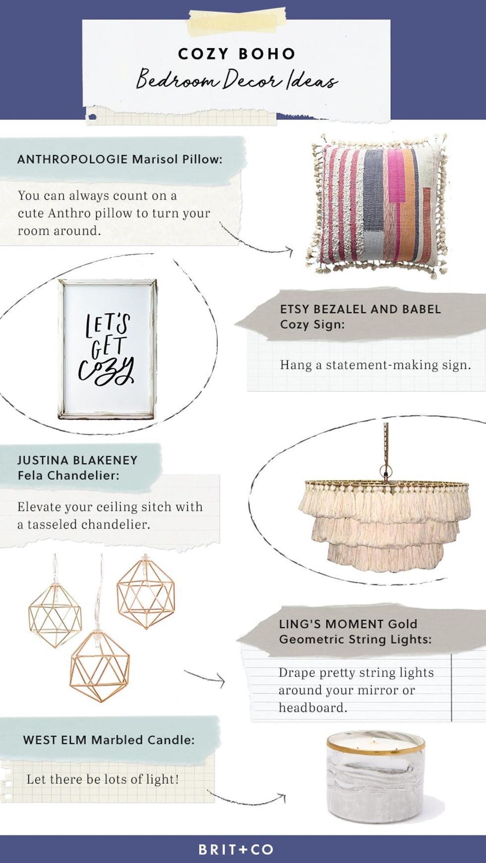 From top to bottom: Anthropologie Marisol Pillow ($135), Etsy Bezalel and Babel Cozy Sign ($32), Justina Blakeney Fela Chandelier ($200), Ling’s Moment Gold Geometric String Lights ($16), West Elm Marbled Candle ($24)