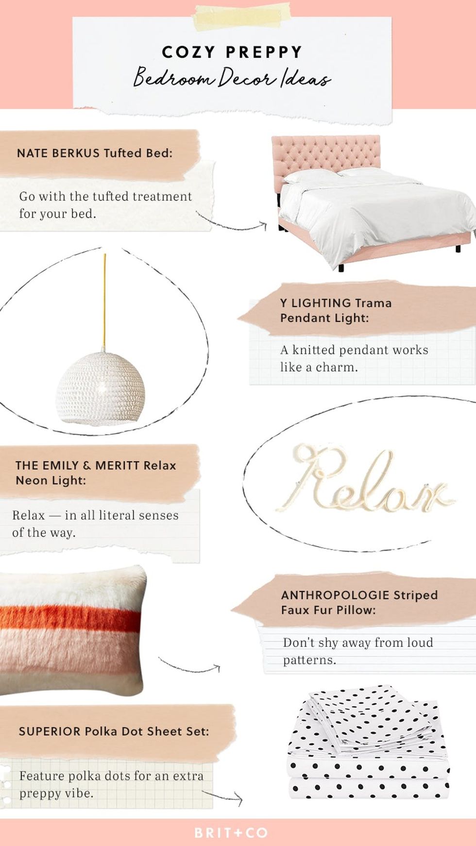 From top to bottom: Nate Berkus Tufted Bed ($675), Y Lighting Trama Pendant ($569), The Emily & Meritt Relax Neon Light ($103), Anthropologie Striped Faux Fur Pillow ($38), Superior Polka Dot Sheet Set ($32)