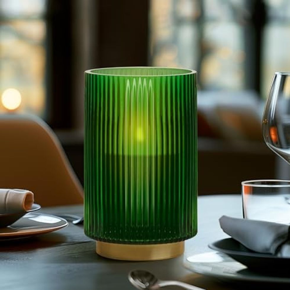 Add color and style to your space with this glass vase that has the most stunning green hue and ribbed design. The sleek metal base adds a touch of luxury, serving as a centerpiece in any space.