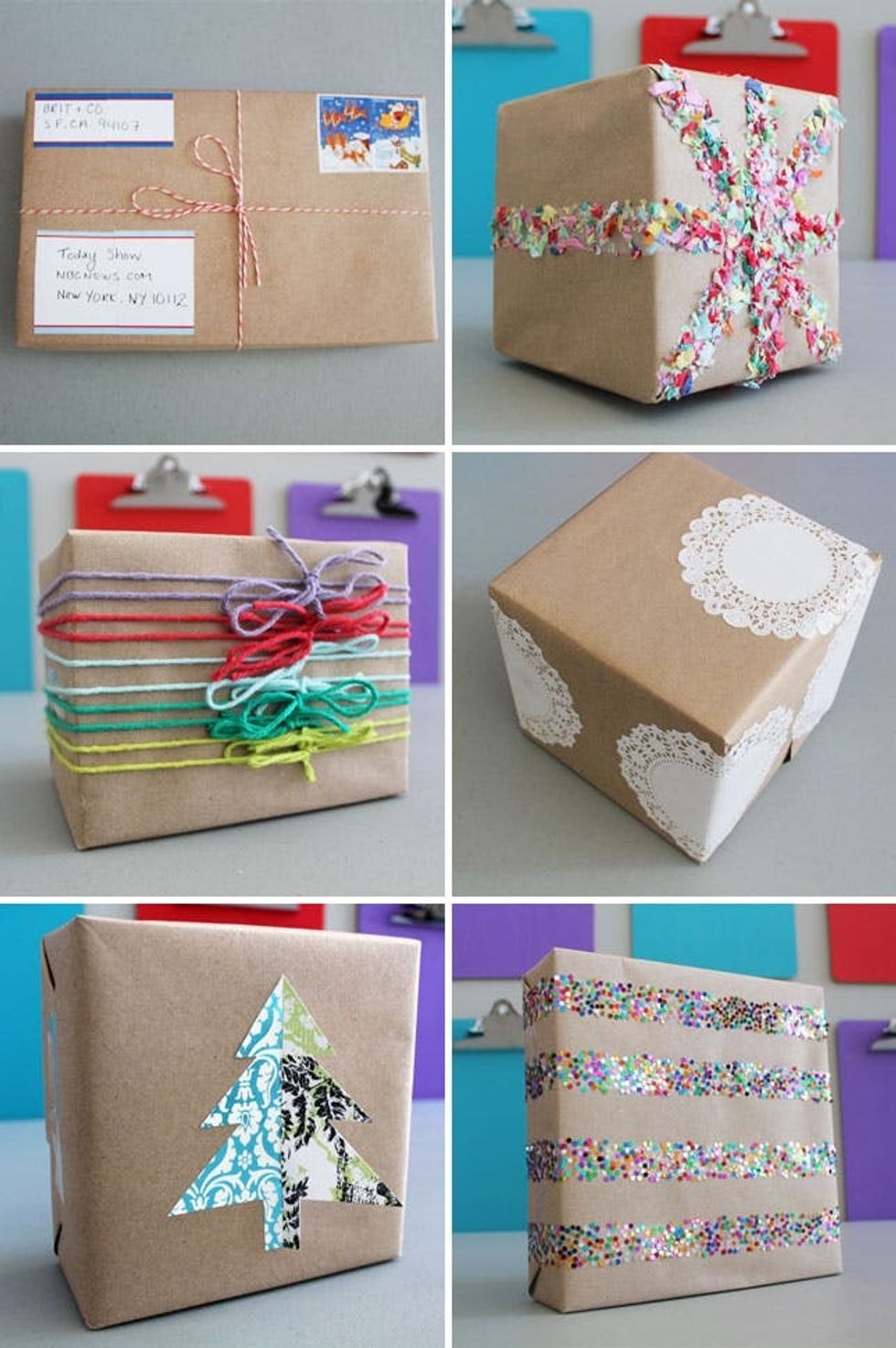 Brown Paper Bags: Use old shopping bags as wrapping paper and spruce up with paper, confetti, twine, yarn, and more.
