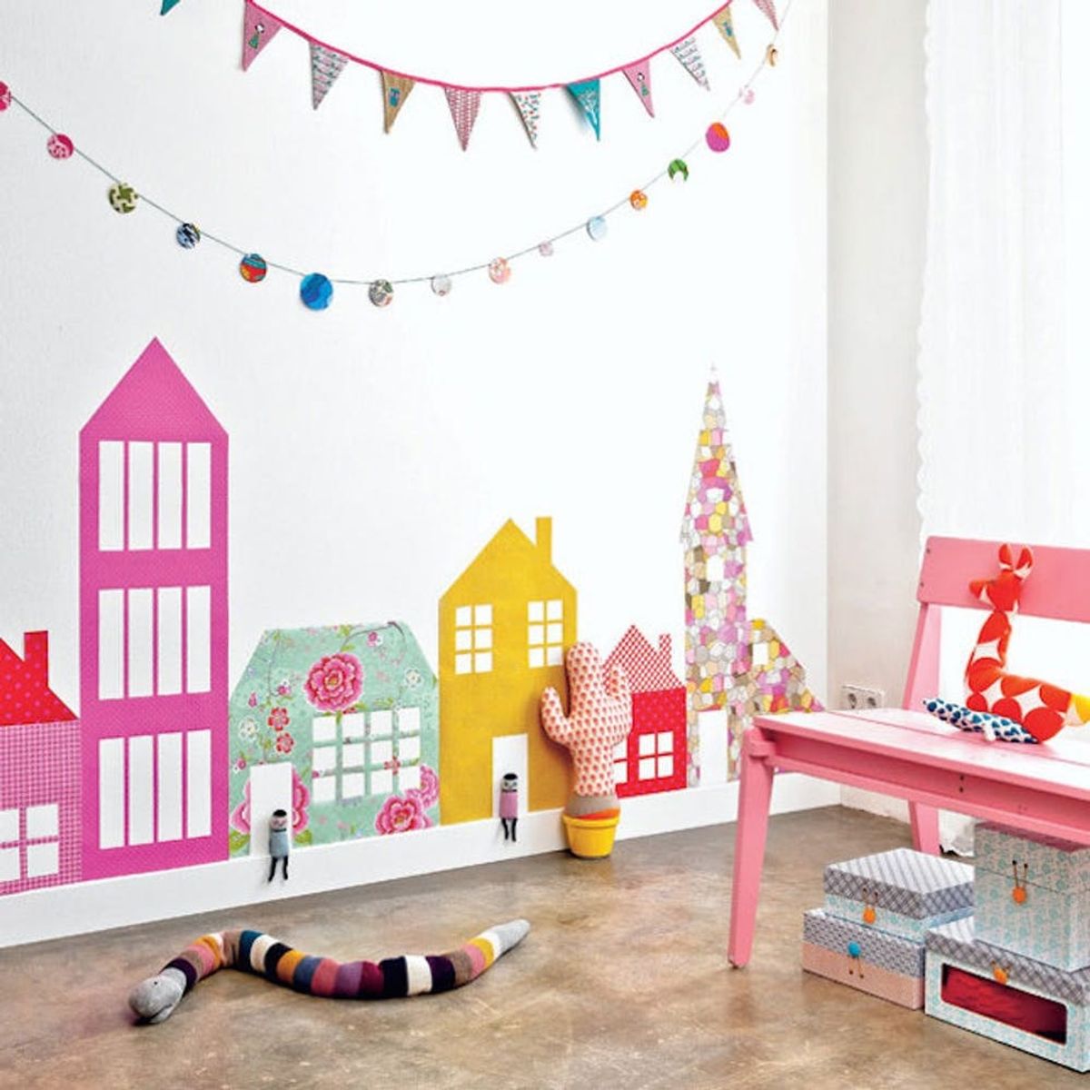 14. Wall Art Decals: Whimsical wall art decals instantly transform white walls into a playful wonderland. Get as creative as you like with this mini city and add colorful garlands and bunting overhead! (via 101 Woonideeen)
