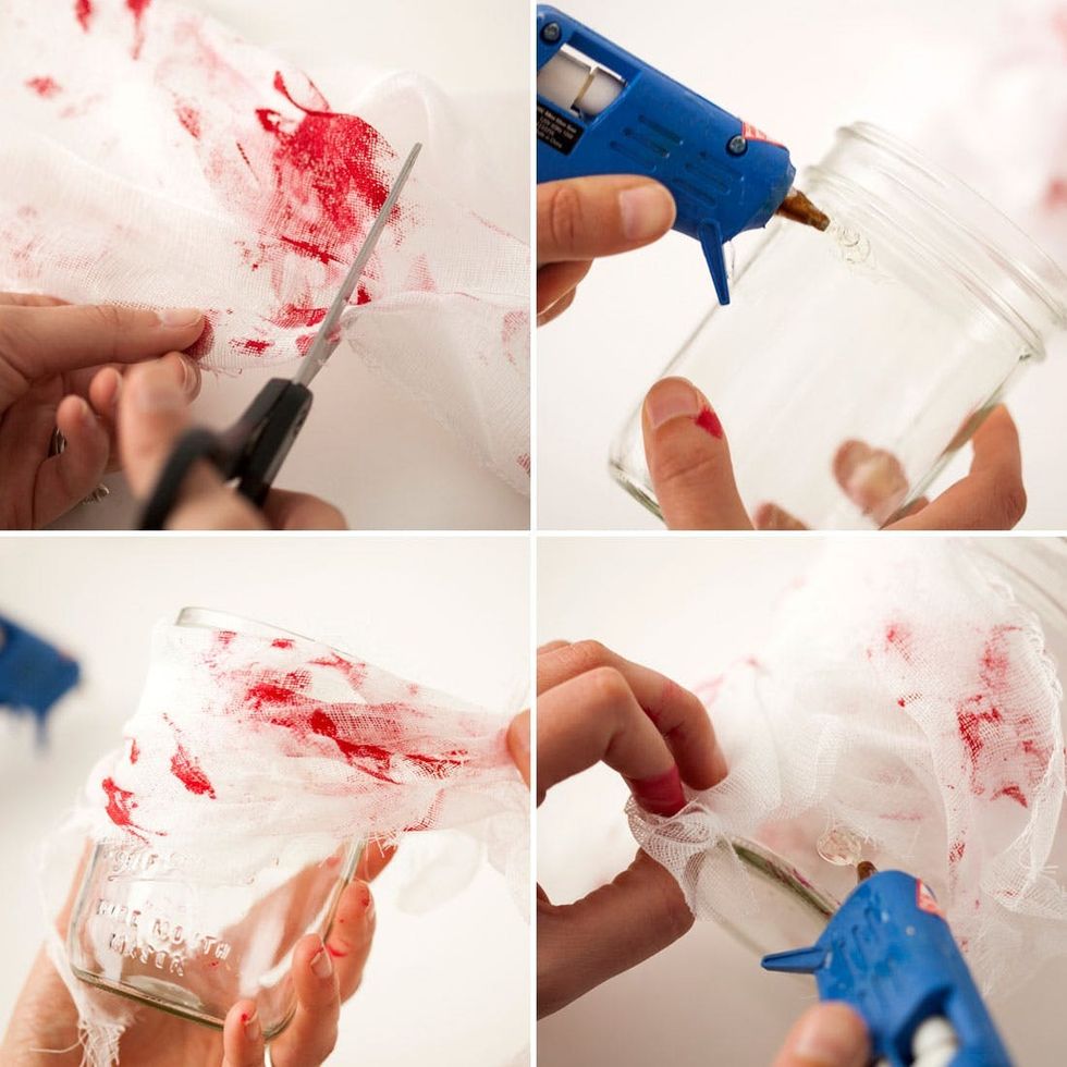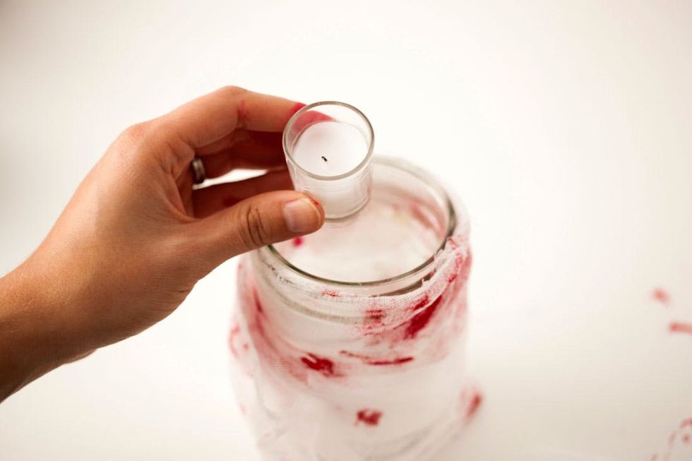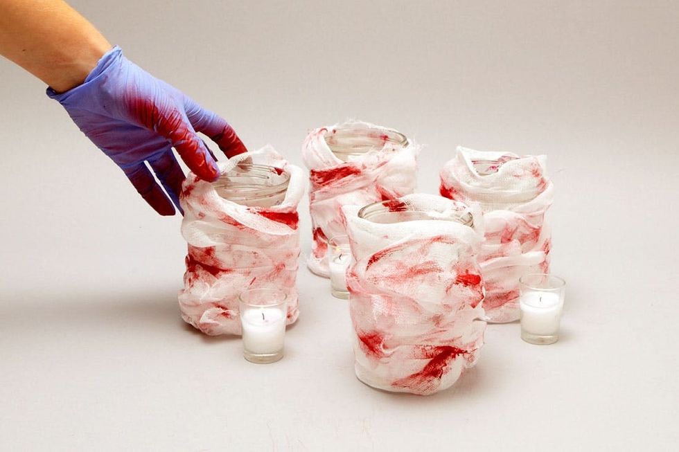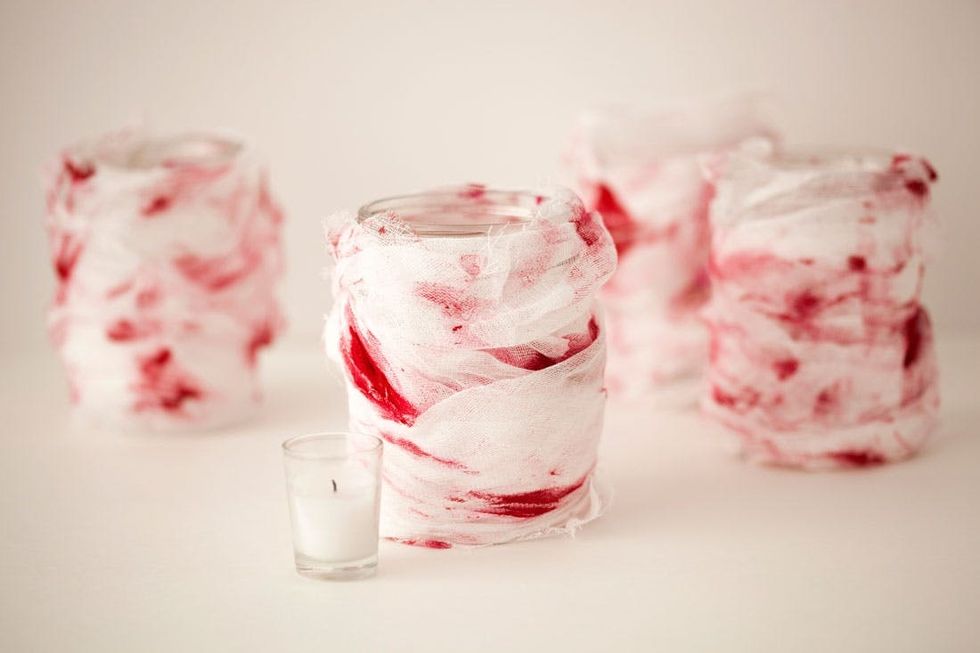 2. Blood-Splattered Votive Jars: Next up, you’ve gotta have some illumination on your table, even if it’s the darkest night of the year.