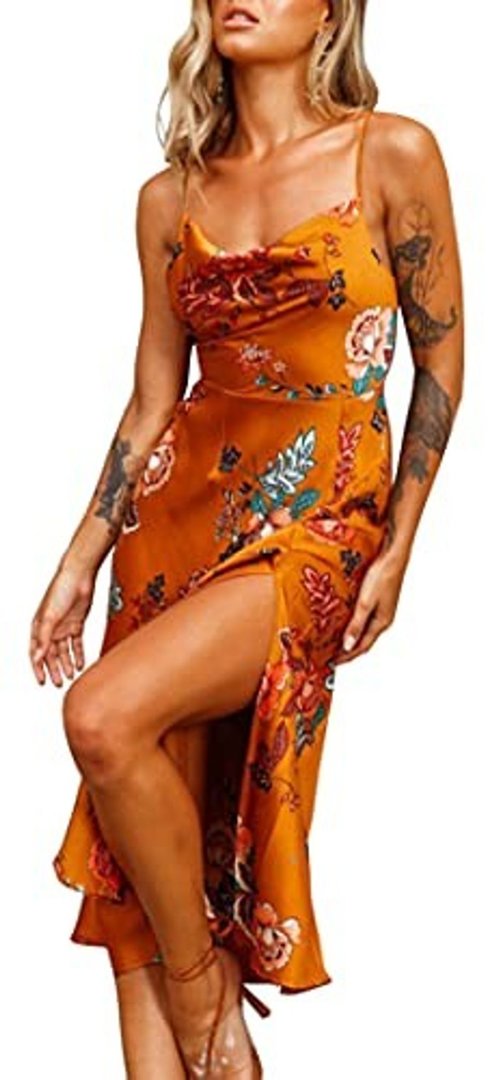 Whether you're hitting brunch, the botanical gardens, or a backyard wedding, you'll fit right in with this floral outfit. With a high slit and breathable satin, this Tsher Spaghetti Strap Satin Midi Formal Dress is great for the hotter weather.