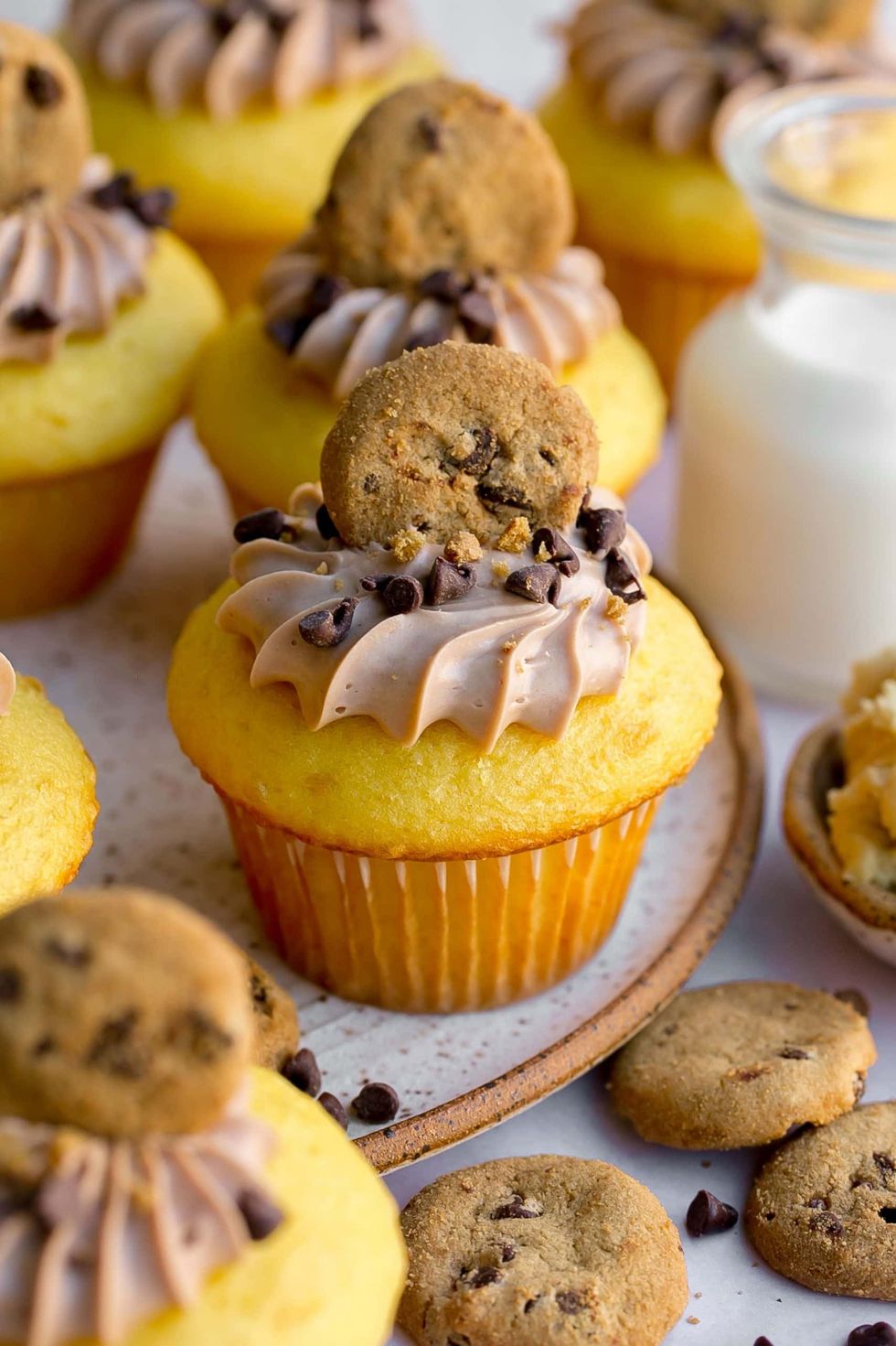 These cupcakes are pure happiness for cookie dough fans. Imagine biting into a cupcake, and surprise! It's filled with edible cookie dough, then crowned with luscious chocolate frosting, adorable mini cookies, and an avalanche of chocolate chips.