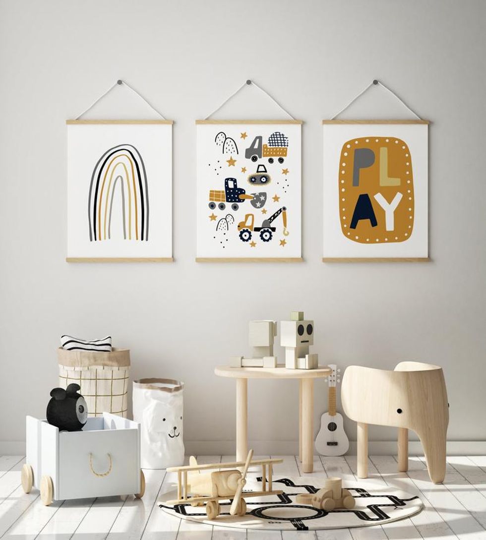 If you're into rainbows like we are, this print set will create a cheery scene in any nursery. We like the rattan kids bed too.