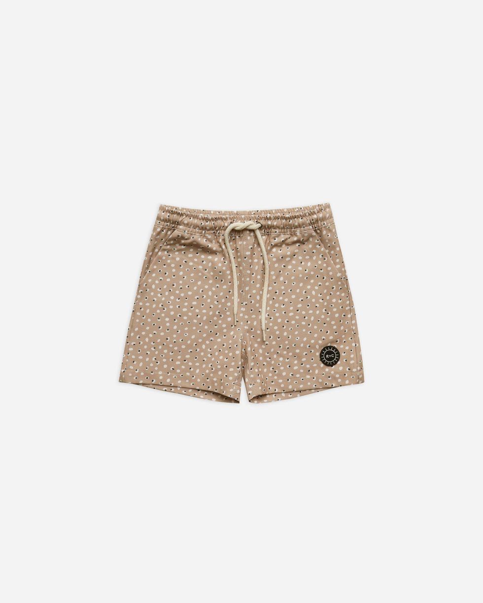 Illustrator Kelli Murray hand-dyes her small Rylee & Cru collection, including these "dotty" swim board shorts, all made in the U.S. (AKA minimal CO2 impact from overseas shipping too).