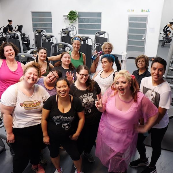 Once my girls got older and I had childcare, I wanted to get back to working out because it’s such a great stress reliever for me and I missed it. I heard about Fat Kid Dance Party after watching a PopSugar video about it, and it looked so fun that I signed up for it at Everybody, a gym that’s all about embracing every single body — no judgments. I chatted with Bevin Brandlandingham, the creator and teacher of Fat Kid Dance Party, who has been a body liberation activist for 15 years. When she moved to Los Angeles a year and a half ago, she was searching for a gym, and when she heard that Everybody was opening, she proposed teaching a Fat Kid Dance Party aerobics class. She loved throwing dance parties in Brooklyn where she used to live, so she thought it was a great way to party and work out. Now, the class meets twice a week.