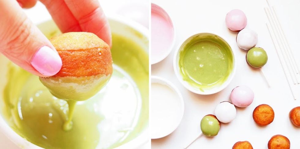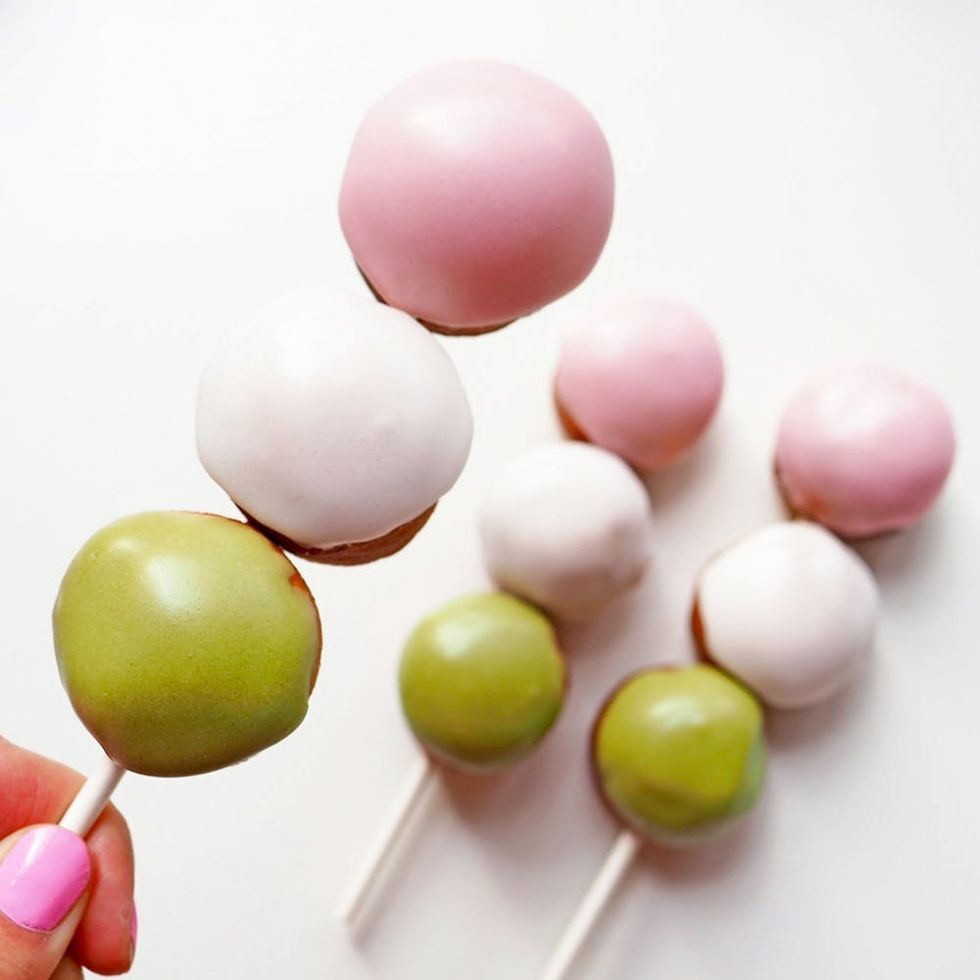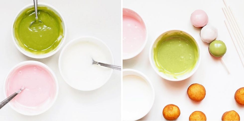 For the regular dango, dip three donut holes at a time: one green, one white, and one pink. While the icing is still wet, insert them into your lollipop sticks: green at the bottom, white in the middle, and pink at the top.