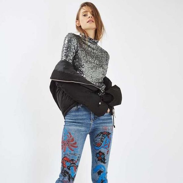 The UK trend masters have been killing it in the denim department for a while now; their Moto denim has a sort of cult following. While not every Topshop option comes in under the three digit mark, a healthy percentage of their fashion-forward offerings do. That makes this a go-to spot for novelty jeans, like the Moto Graffiti Print Straight Legged Jeans ($95), that look high end at a way lower price.
