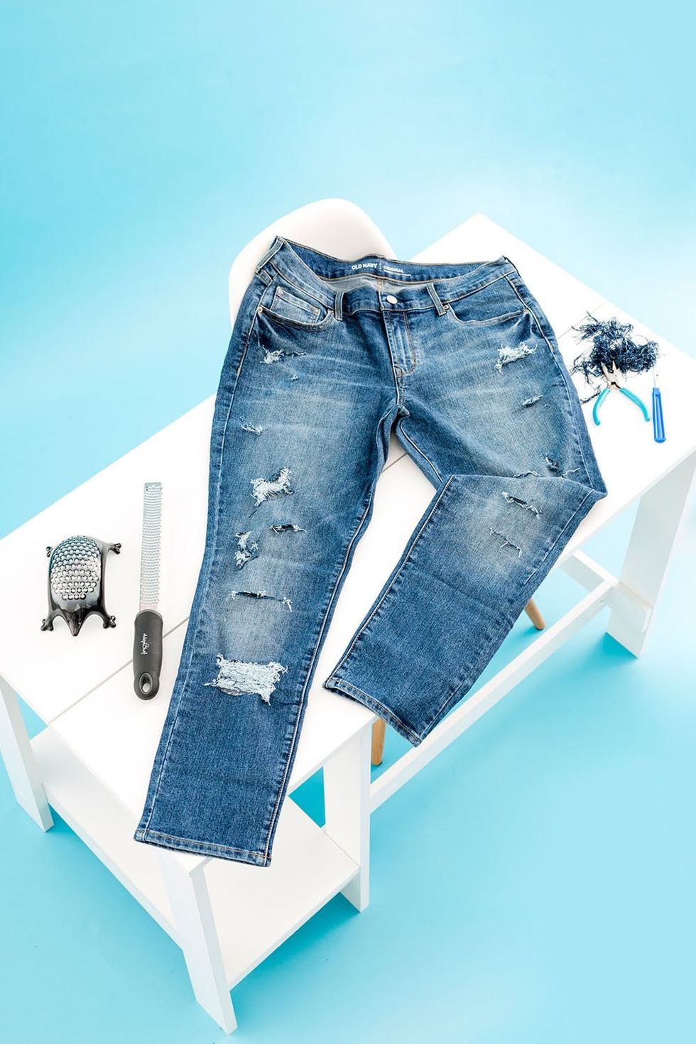 Add more areas of distress by cutting slits in the jeans and distressing the edges or just taking a cheese grater straight to the denim.