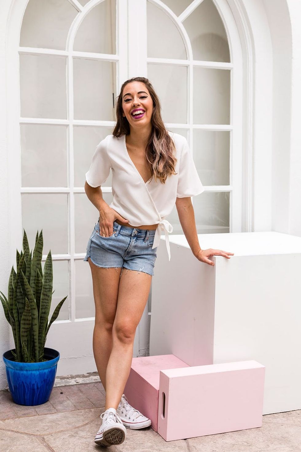 Pro Tip — You can always cut off more, but you can never add extra back on. This is the golden rule for creating cutoffs. Measure five inches down the inner leg of the jeans and cut off. Try the jeans on and use chalk to measure the perfect length for your body. When trimming off the extra jean, you’ll want to cut a straight line that slightly curves up once you reach the outer edge. This will give your cutoffs more of a polished look.