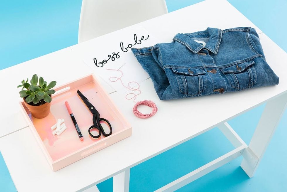 Print out your stencil and trace the back of the letters with chalk. Place (face up) onto your jacket and use a capped pen to trace the letters. Remove the sheet and trace the chalk outline with a washable marker. Use a chain stitch to stitch in the phrase of your choice.