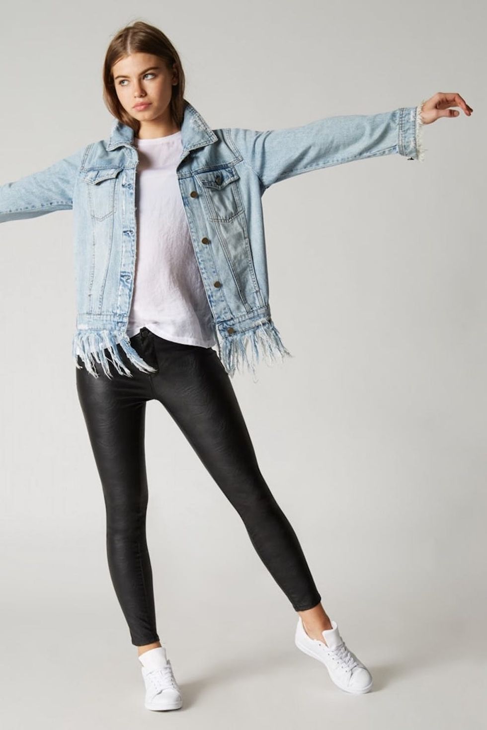 8. Topshop Moto Oversized Denim Fishnet Jacket ($130): Go punk with this ’90s-esque denim jacket featuring fishnet inserts… well, all over. A snap-front denim mini and Dr. Martens will ensure a hella dope lewk.