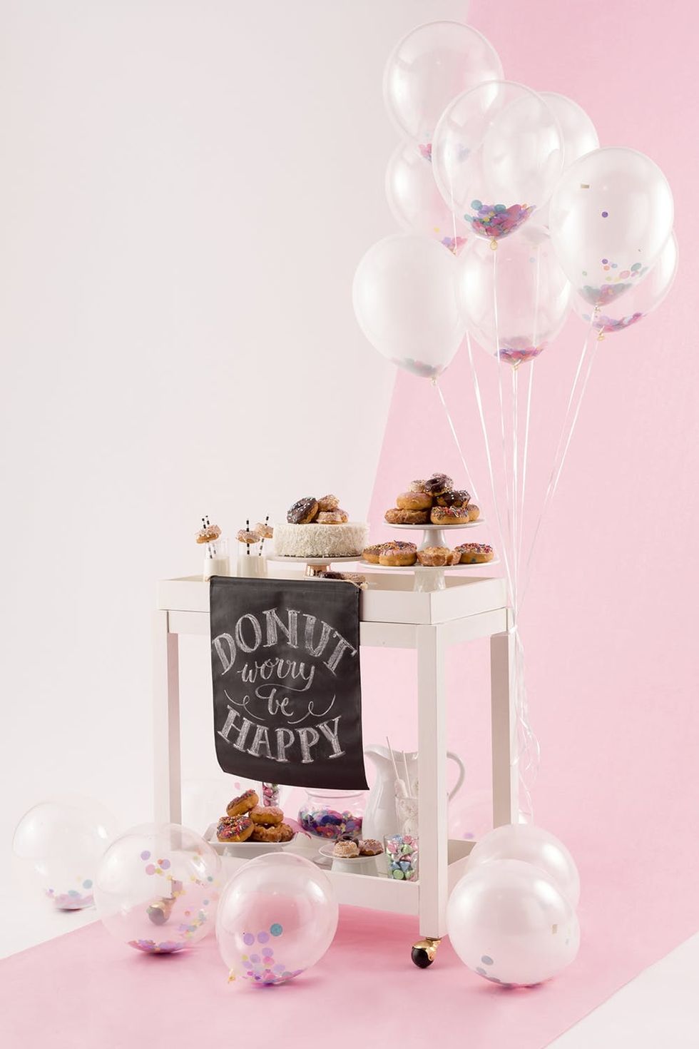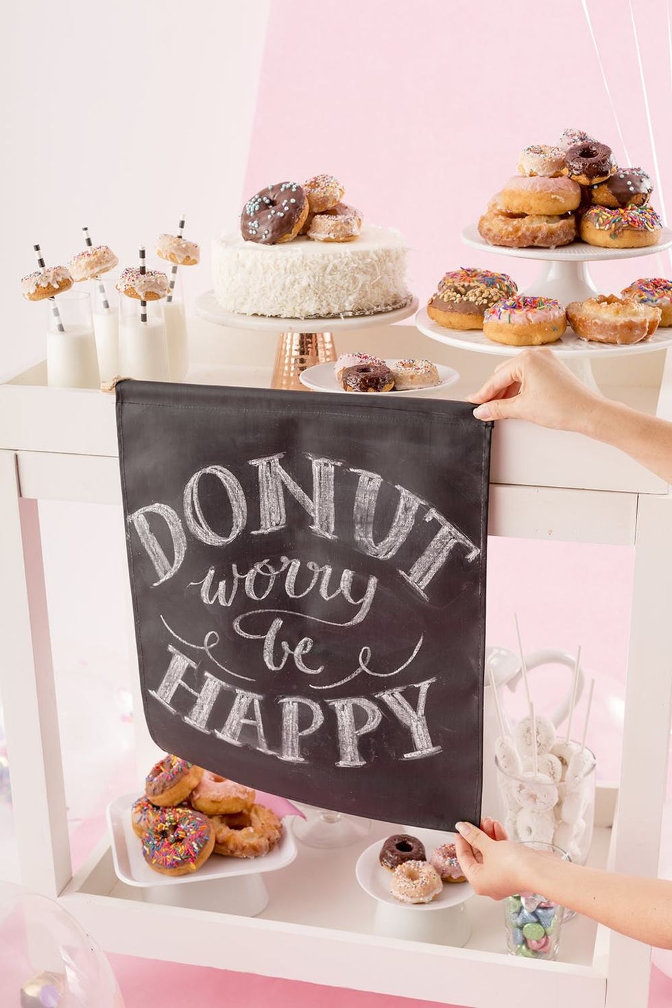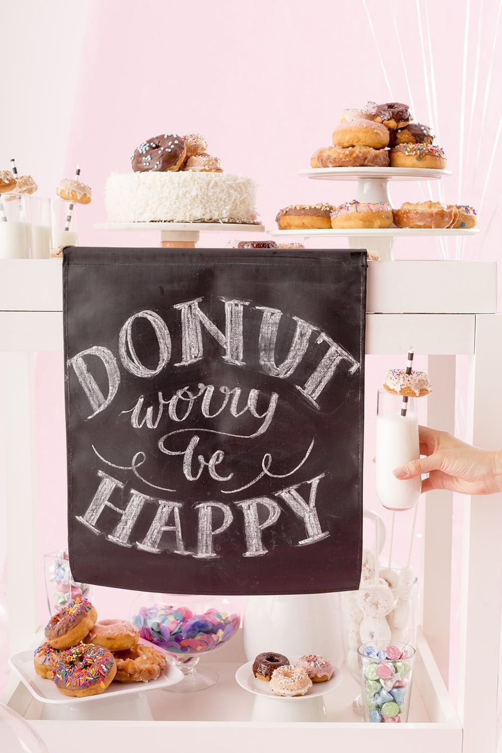 One of the key ingredients to the cart (besides the donuts, of course) is this adorable chalk lettered banner. Adding a sign to any cart adds a fun focal point to the scene and makes it extra Insta-worthy. Brit + Co’s Chalk Lettered Wall Art Kit ($20) is exactly what we needed. You can pick up yours, as well as any of the other 14 DIY kits at Target or on Target.com.