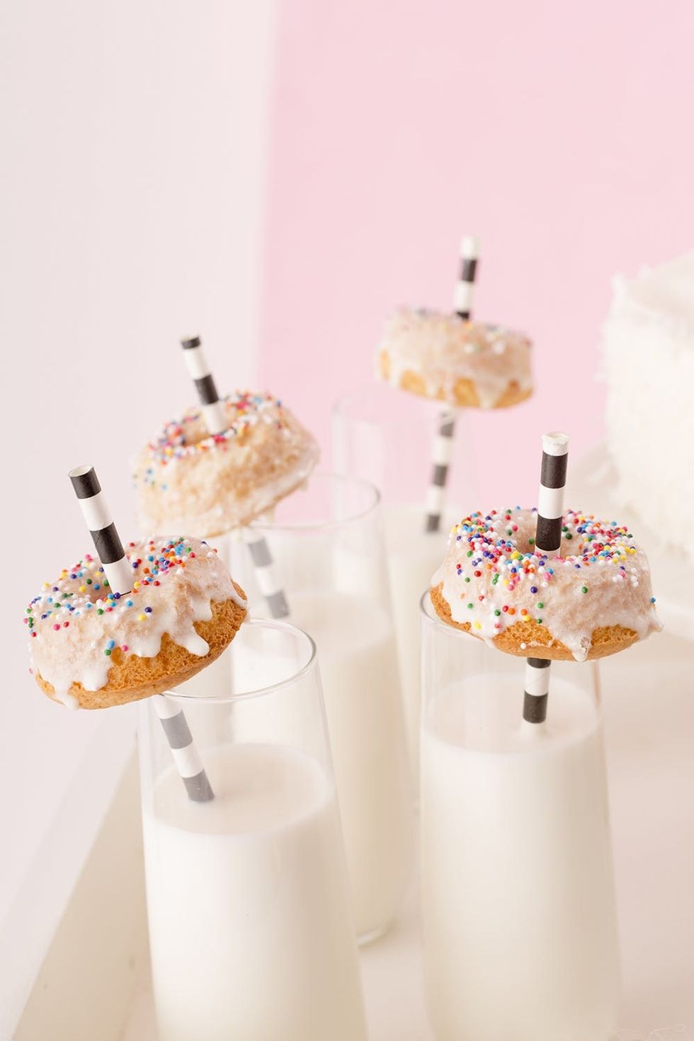 Ice cold milk is *necessary* when chomping on dessert. Place mini sprinkle donuts on milk glasses for your friends to enjoy while sipping.