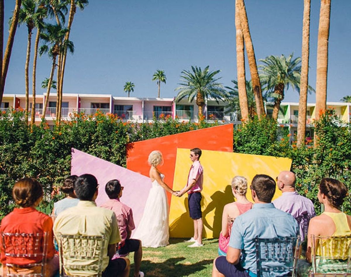 3. Palm Springs, CA: Whether you’re a mid-century architecture buff or just love that SoCal sun, Palm Springs is a great destination for a super mild winter wedding. The abundance of spas and luxurious hotels also make this a great spot for hosting a bachelorette party. If you’re headed to this city of palm trees, make sure to check out the The Saguaro Hotel, which is an explosion of color to say the least. (image via Wedding Chicks and Mark Brooke)