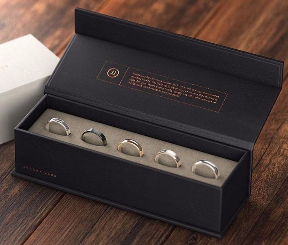 2. Jordan Jack: Struggling to find a time with your fiancé when you can both go shopping for his wedding band? Don’t stress! This site lets browse wedding band styles (everything from trendy to classic, in a variety of sizes) and select five to be shipped right to his doorstep. He’ll have three days to try them out and figure out which one is The One. (Photo via Jordan Jack)
