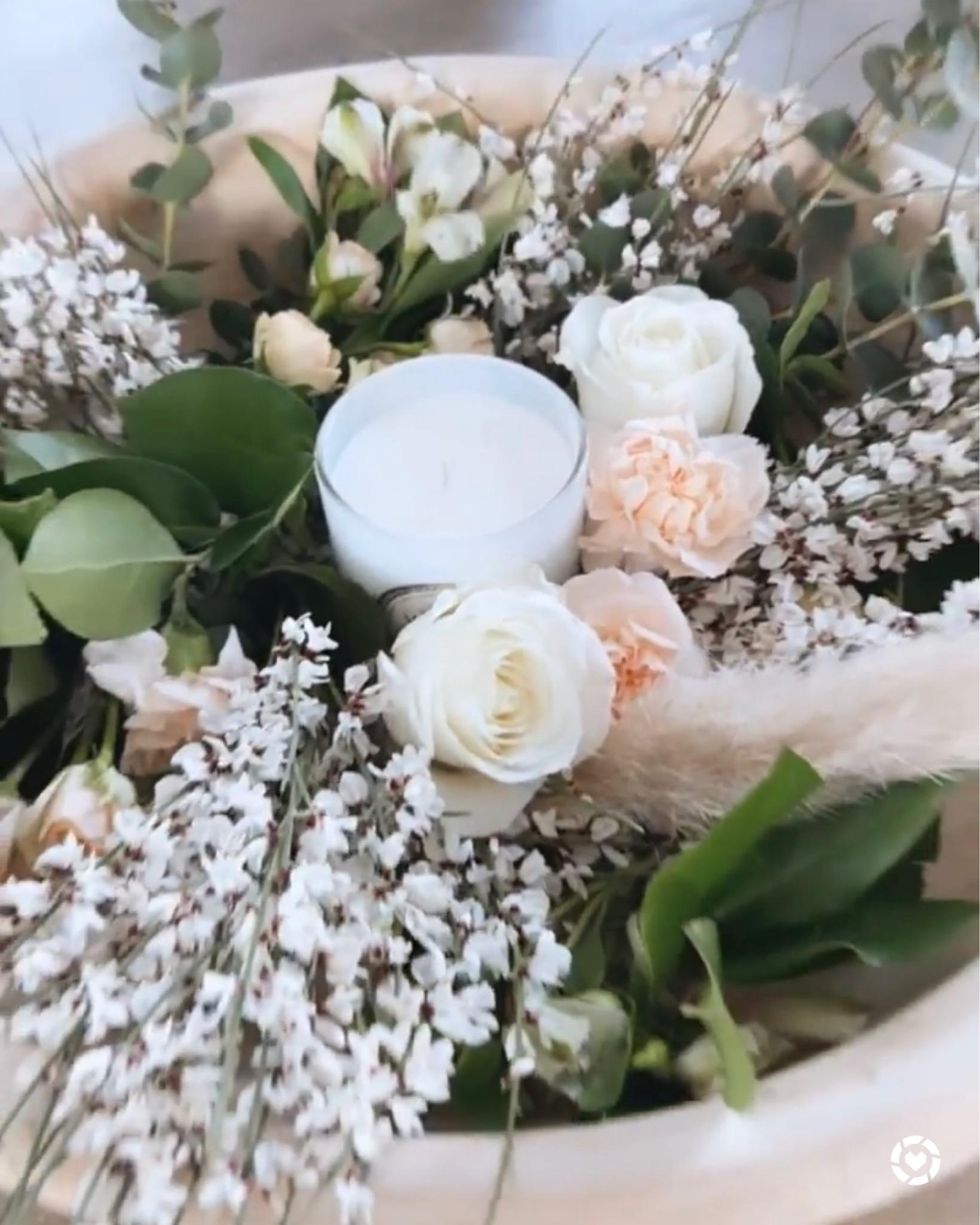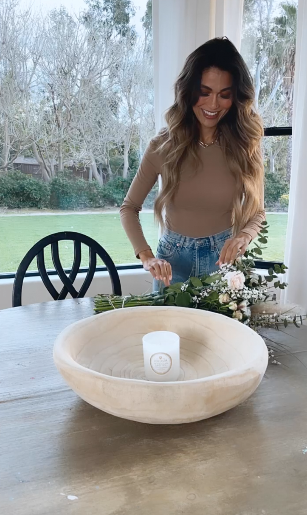A large wooden bowl, a glass candle — I prefer scented, it can help elevate the atmosphere — and some fresh blooms or plants of your choice that will dry out nicely.