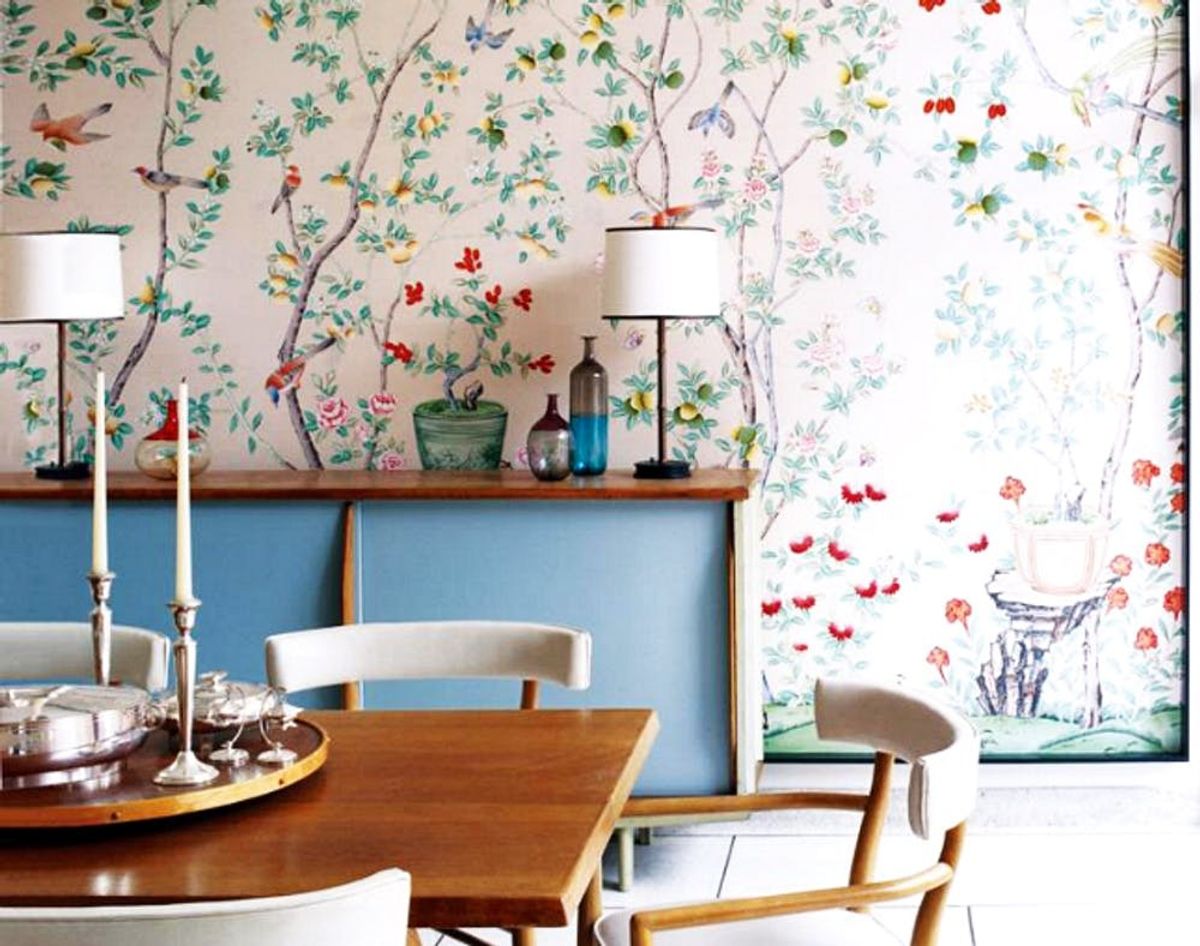 7. Geometry Meets Nature: We think this room is incredible. Just look at the contrast between the floor tiles, the wall paper and those modern turquoise chairs! (via BA Interior Design)