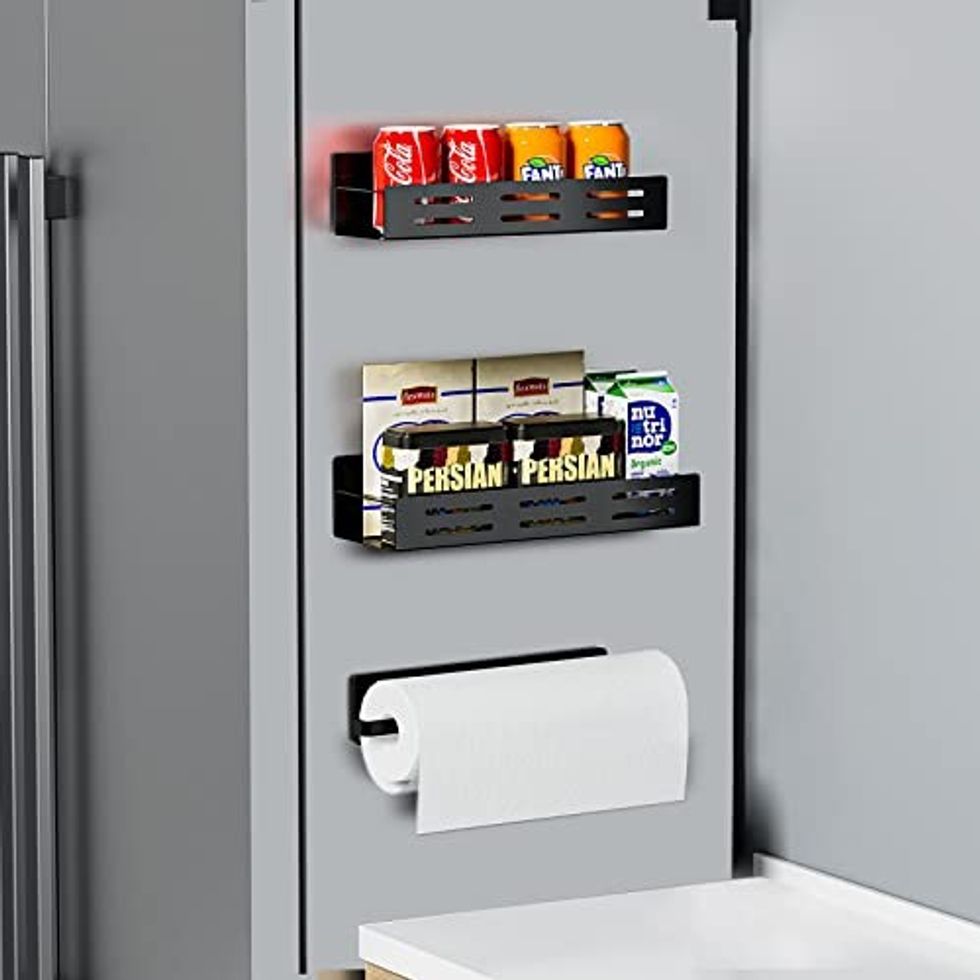 These magnetic metal shelves stick right on the side of your refrigerator for more storage space and efficient use of your fridge's naked side.
