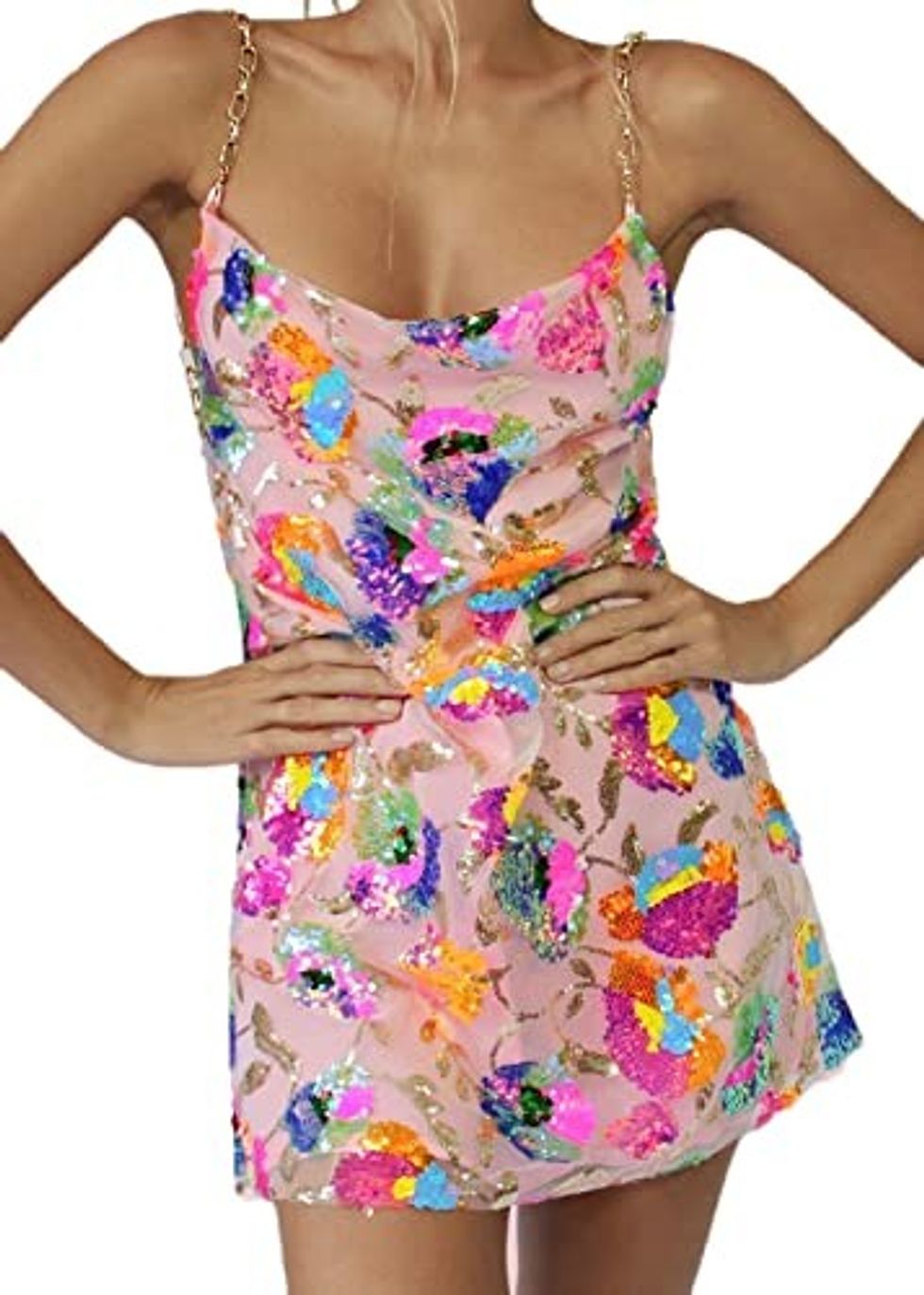 This Sparkly Sequin Dress is a must-cart with its backless, low-cut style paired with the spaghetti straps at the top. This piece is the ideal addition to any summer wardrobe, adding a touch of glamour and sparkle to your look.