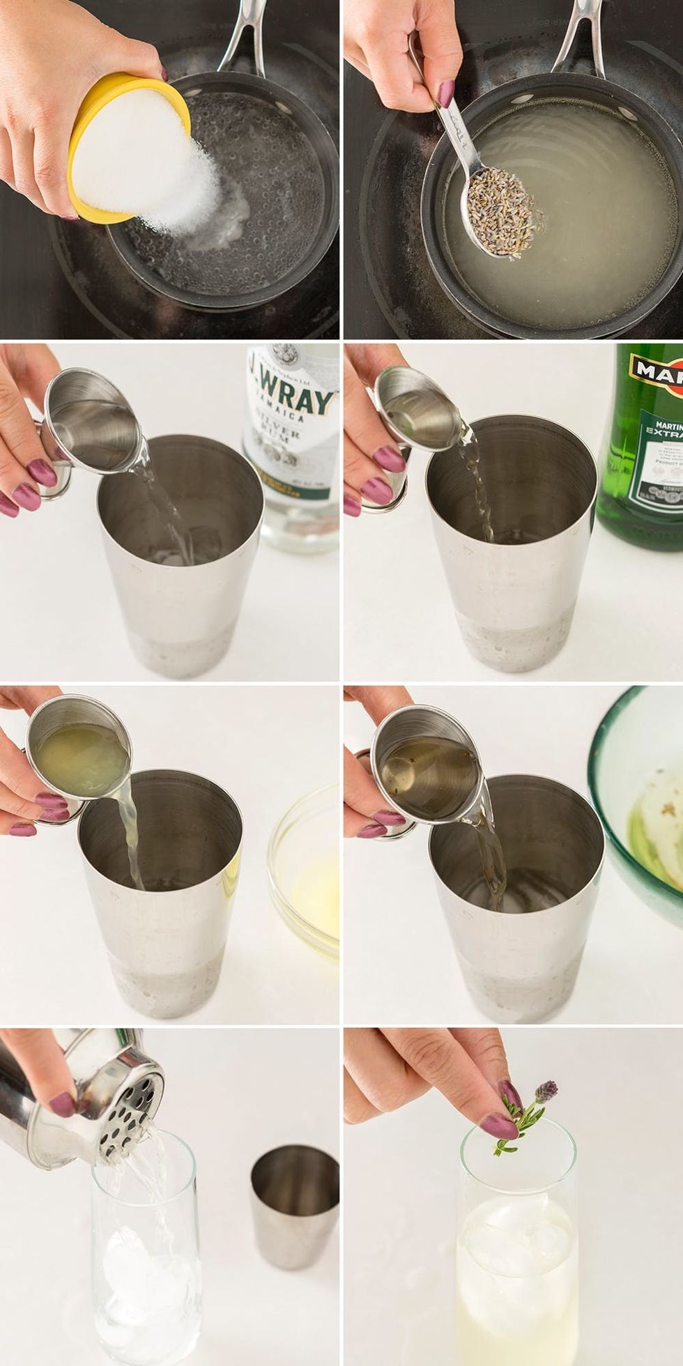 To achieve the golden color of the juice, mix the rum, vermouth, lemon juice, and lavender simple syrup in a cocktail shaker. Pour out the juice, and top the glass off with some sparkling water and a sprig of lavender.