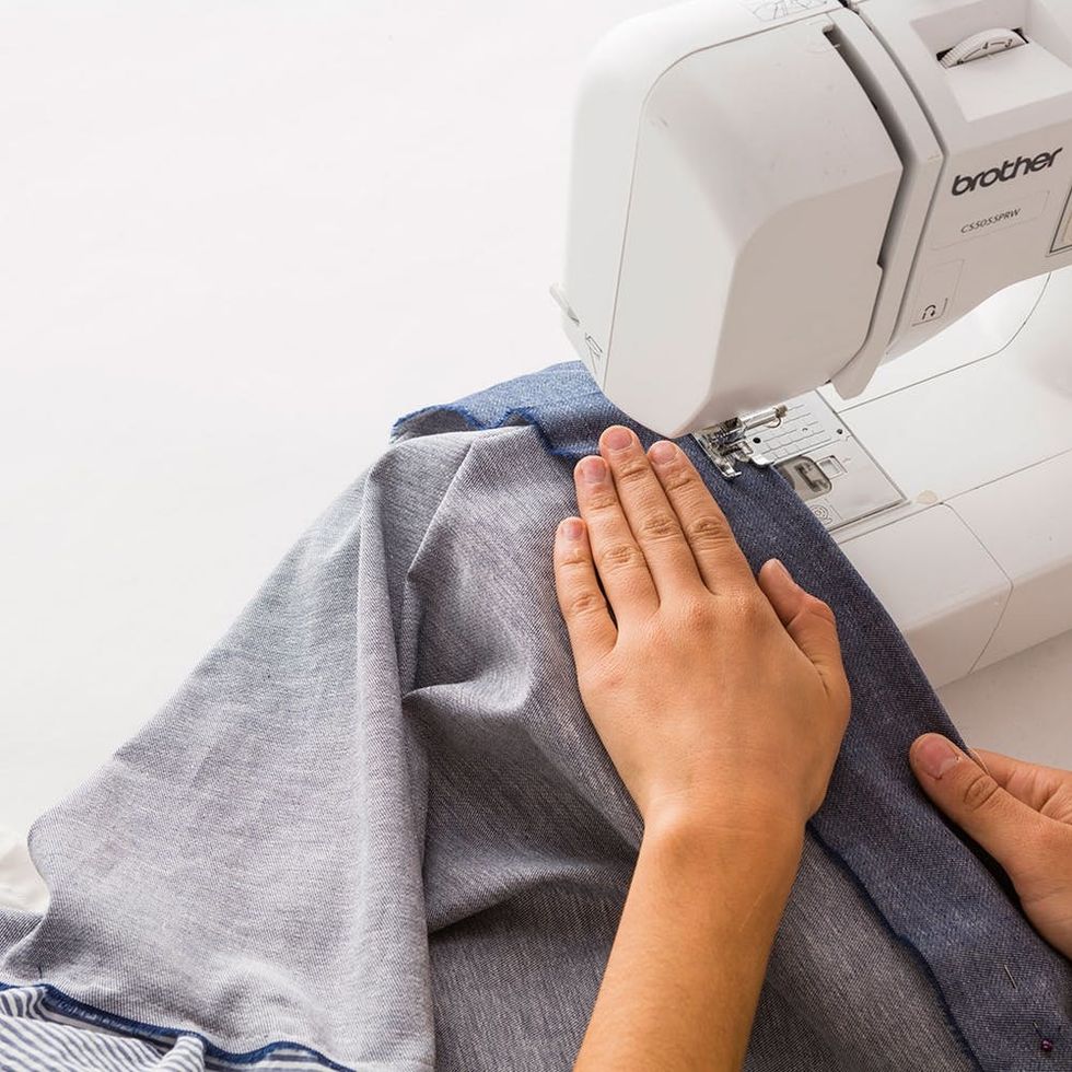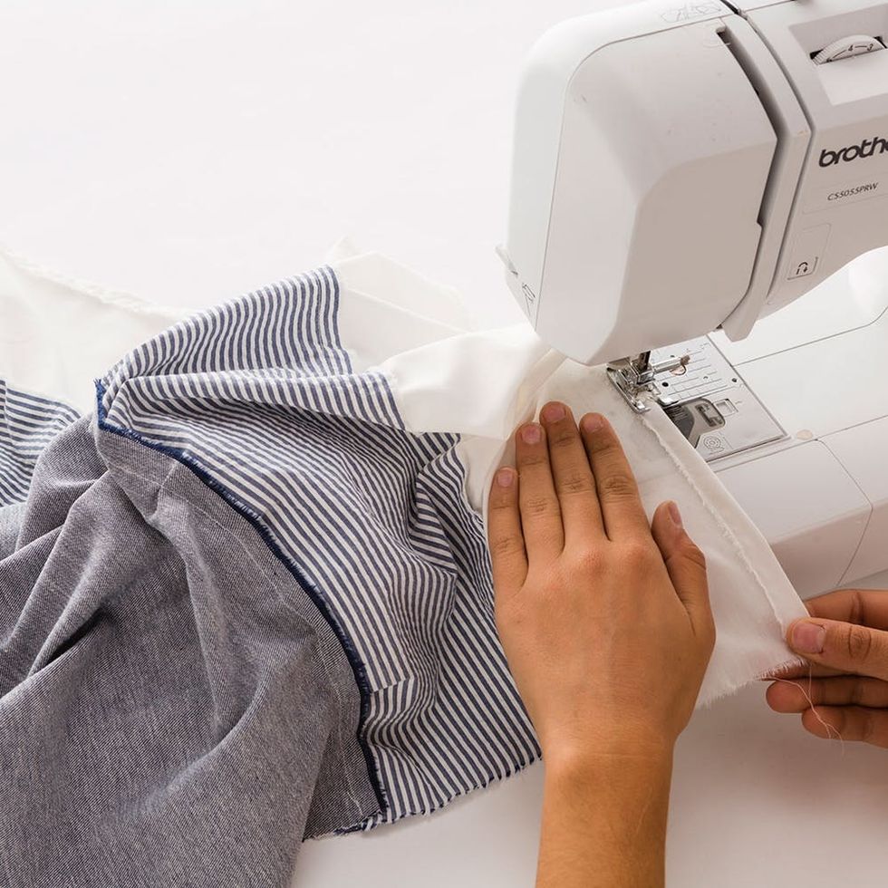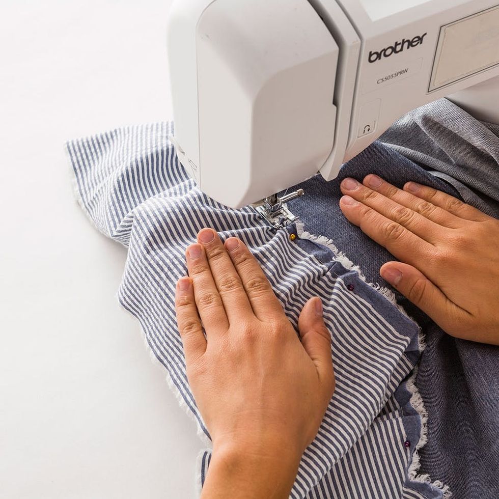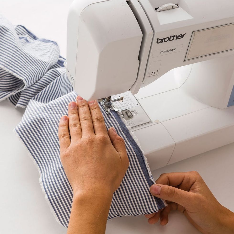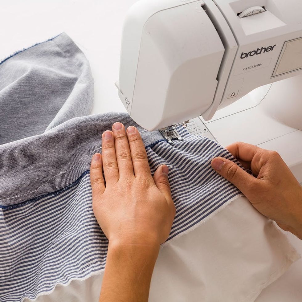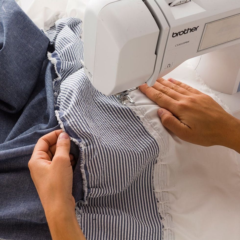Set your sewing machine to the longest stitch setting and setting 1 for tension. Sew a straight line down the long edge of the seersucker and white fabric.