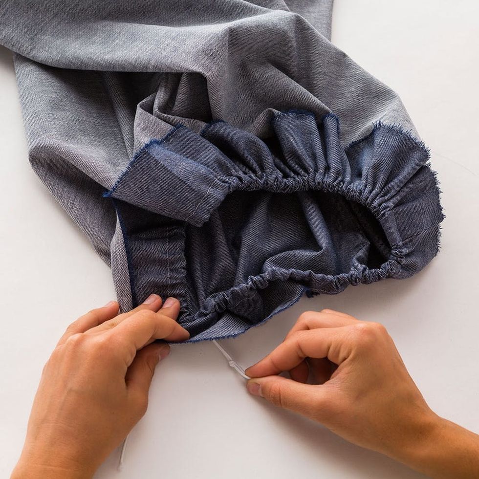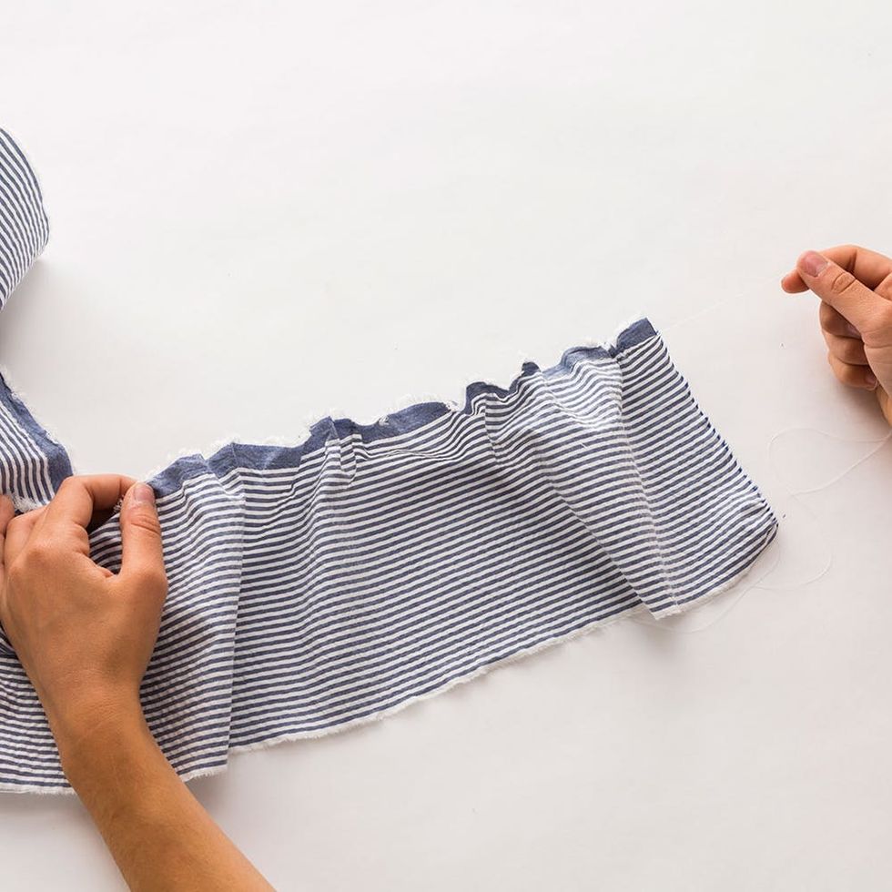 Grab the top and bottom string of the stitching and pull to create ruffles in the fabric.