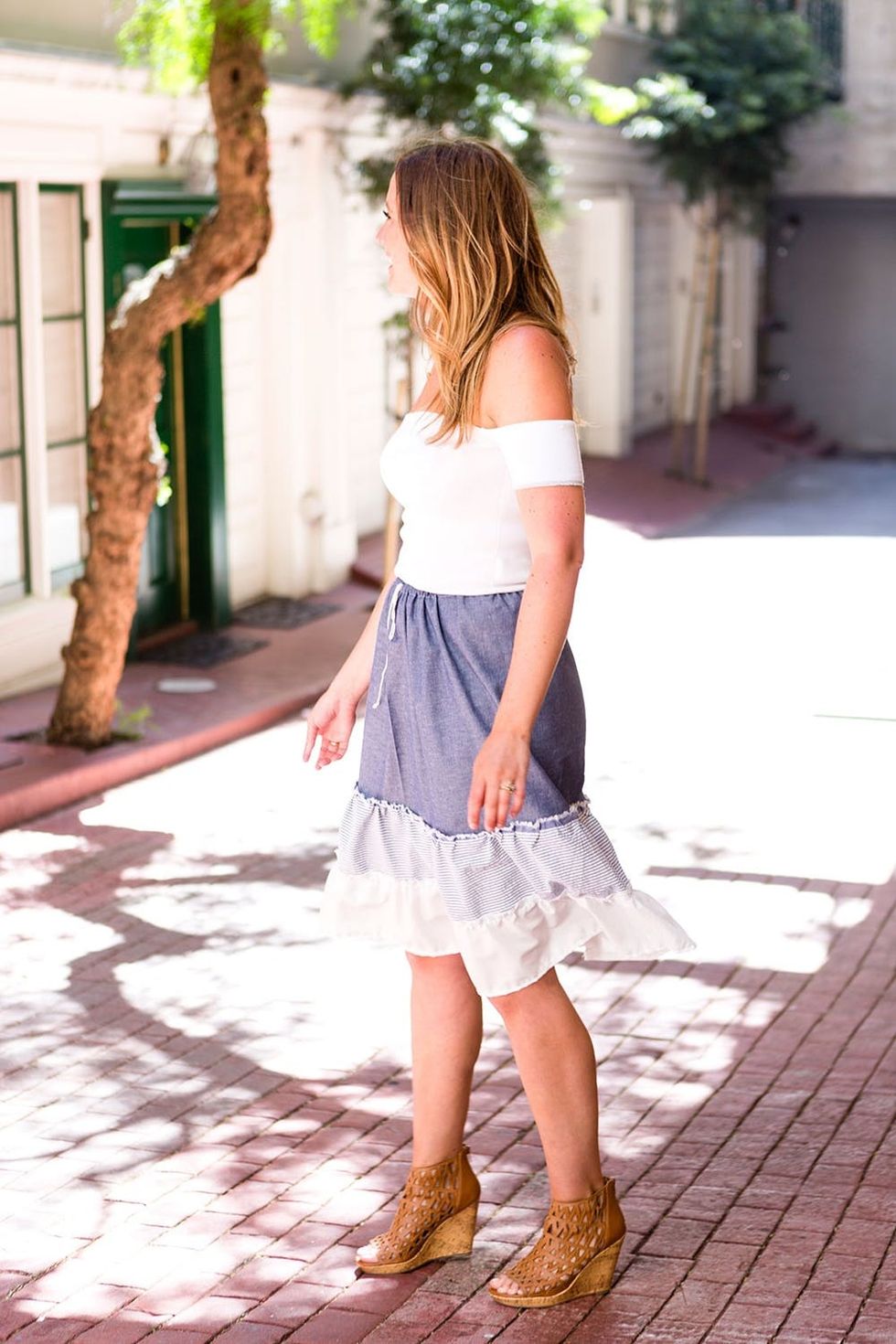 Pair this layered skirt with a stacked heel and a trendy off-the-shoulder top.