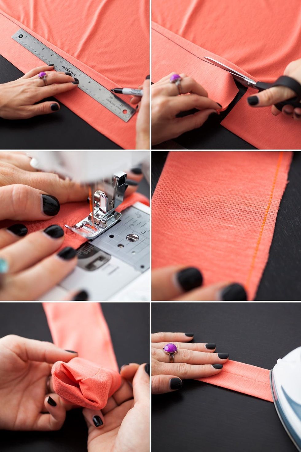 For each of these tutorials, you’re going to start by cutting a piece of fabric, folding it in half, sewing it, and then turning it inside out. This will be the base of each headband.