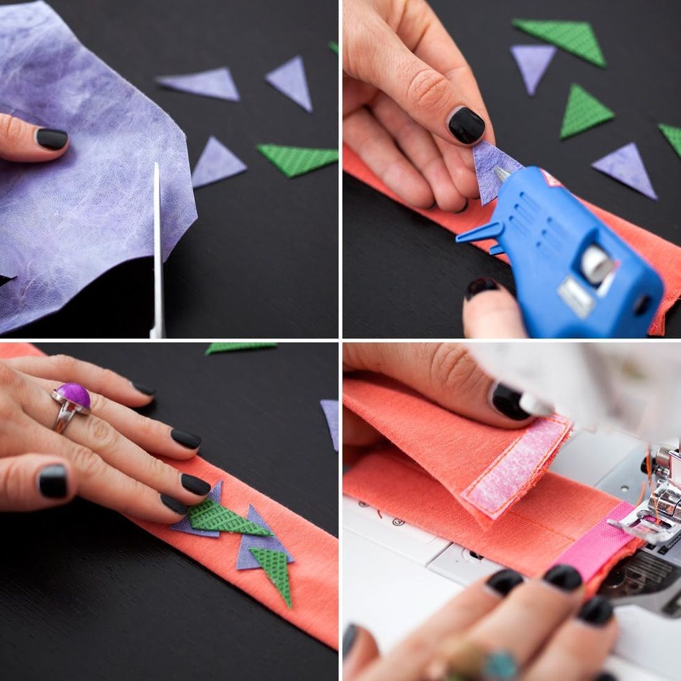 After you’ve made your headband base, tie it into a knot in the middle. Use decorative stitches and brightly colored thread to create three stripes on each side of the knot. To close the headband, measure a piece of VELCRO® Brand tape that fits and sew it on!