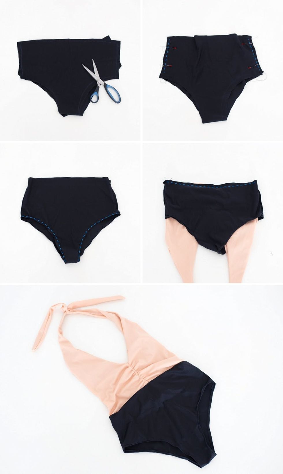 Wearing your swimsuit, spot a point under your belly button and use a tailor’s chalk to mark it. Then take the swimsuit off and draw a horizontal line all around, as shown in the picture above. Next, cut along the line, then cut the bottom piece on the sides as shown above to create a flat, open shape. We’re going to use this as a template — take your black elastic fabric scrap and trace the pink shape outline using the tailor’s chalk.