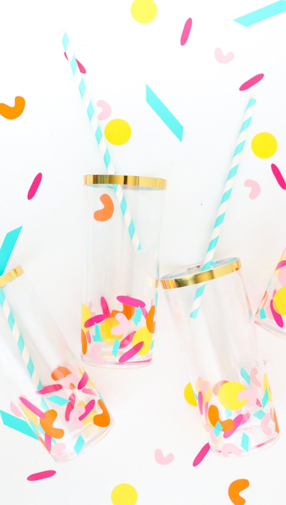 DIY Confetti Glasses: Is your bar cart ready for a season of spiked lemonade and boozy ice tea? Upgrade basic acrylic glasses with vinyl “confetti” for a truly summer-worthy bar setup. (via A Kailo Chic Life)