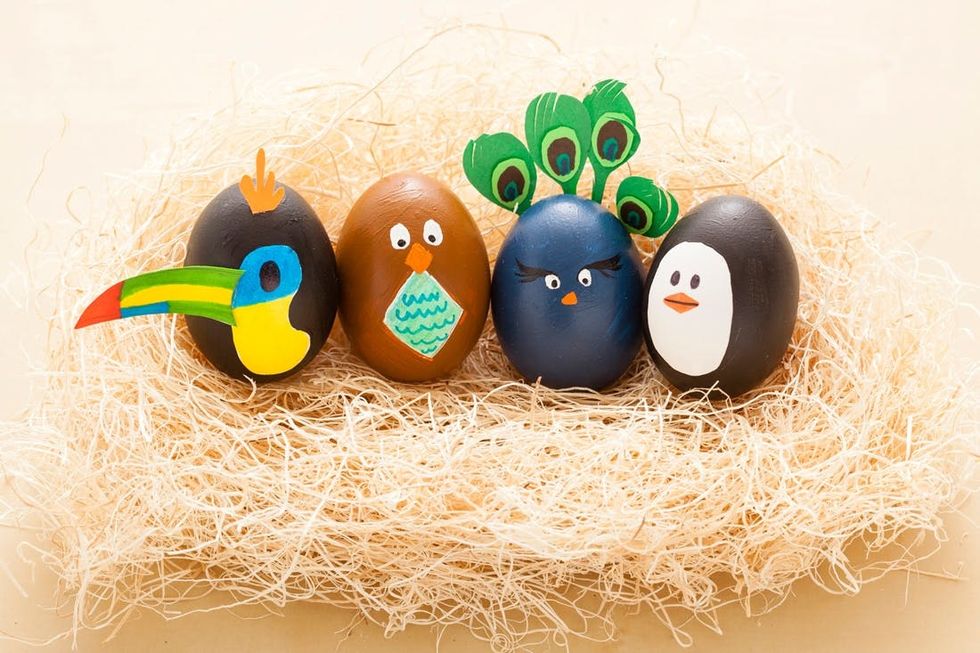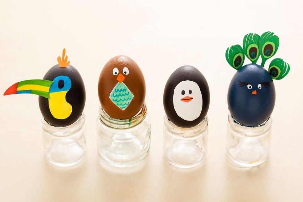 What came first, the chicken or the egg? Well, in this case it was the egg… and then we turned them into our four favorite birds. A toucan, an owl, a penguin and a peacock: an egg-ceptional bunch if you ask me! ;) What is super great about this Easter egg DIY is that the supplies we used for this transformation are SO basic: craft paint, card stock and Sharpies — no templates or fancy dye required!