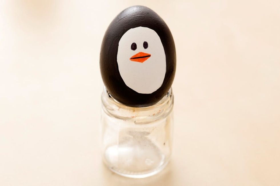 This penguin is extremely easy to make. Using a pencil, draw an oval shape on the front of the egg. Next, paint everything black except the oval: This will be the face of the penguin. Once the paint is dry, use a black Sharpie to draw two oval eyes and an orange Sharpie to draw a diamond mouth.