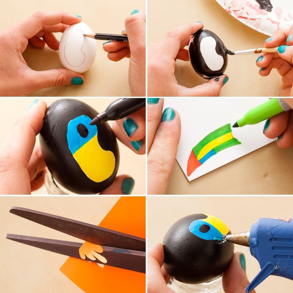 Mr. Toucan takes a tad more effort to make than the penguin, but it’s worth it! Using a pencil. draw a kidney bean shape on the front of the egg. Next paint everything black except the kidney bean shape: This will be the face. Using Sharpies, color in the top third of the kidney bean light blue and the bottom two-thirds yellow. Draw a large eye on the light blue portion.