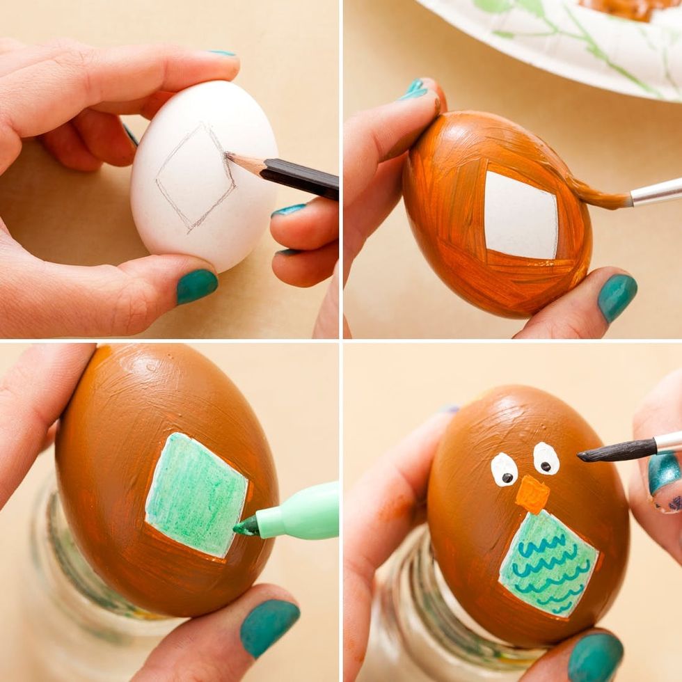 Time to make the owl. Using a pencil, draw a diamond on the front of the egg, then paint everything brown except for the diamond, which will be its belly. Once the paint is dry, color in the diamond using a teal Sharpie. Add some feather detailing with wavy lines. Then, time to crack open that orange paint! Add an orange diamond for the beak and white and black paint for oval eyes.