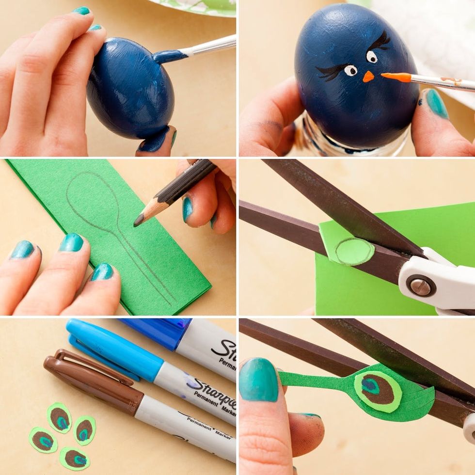To make the feathers, you will need to cut out four spoon-shaped pieces from dark green card stock and four small ovals from the light green paper. Using the brown, light blue and dark blue Sharpies, create the eyes of each feather. Glue the feathers together and attach to the back of the egg using the hot glue gun.